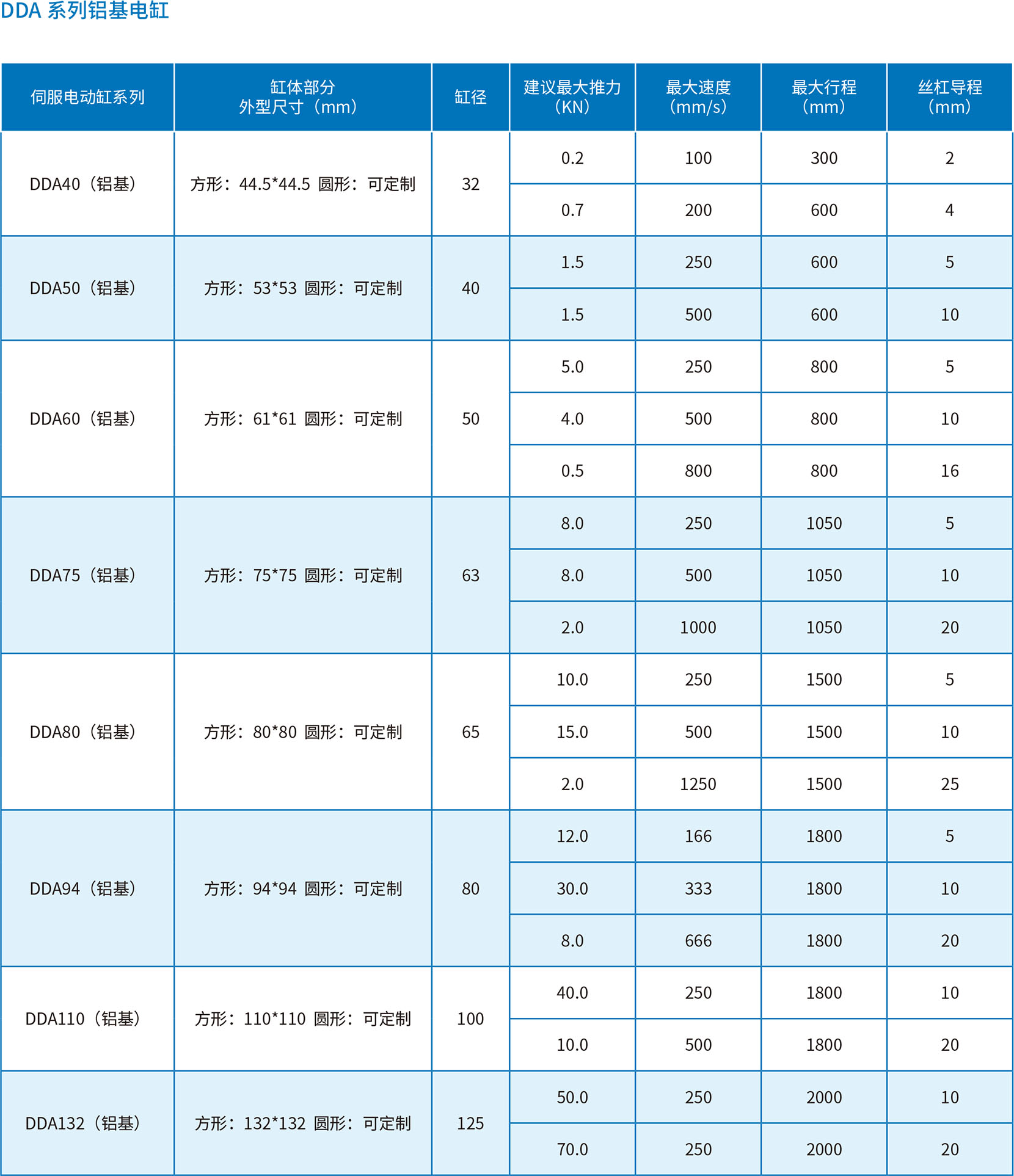 • 推力:可增设减速等机构,降低电机功率,实现大推力